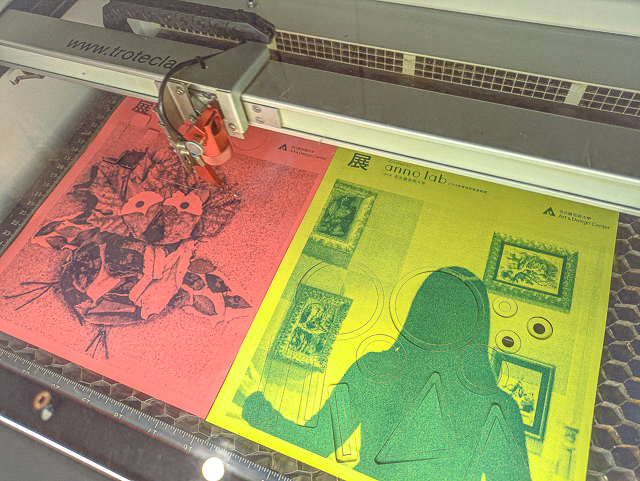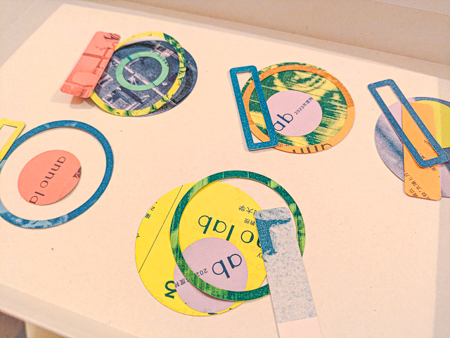 レーザーカッターで切り抜いたフライヤーで、いろいろな「a」を作って台紙に貼って制作しています。
