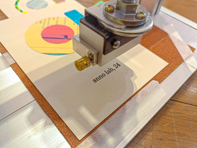 最後に、最近購入した簡易活字印刷機で「anno lab, 24」と活字印刷を行い、「あの年賀2024」の完成です!